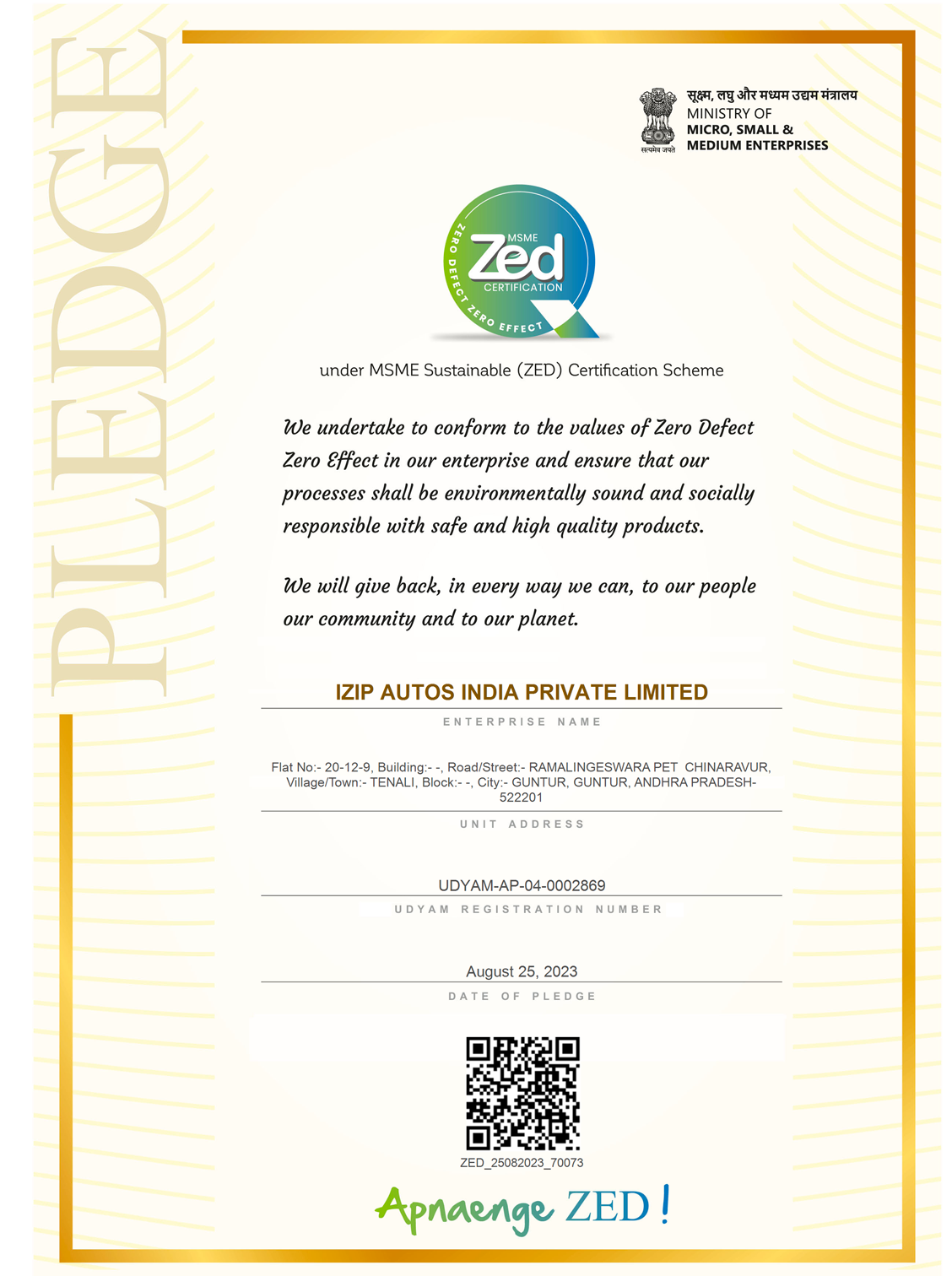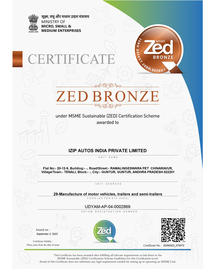 iZip Autos is proudly headquartered in Amaravathi, Andhra Pradesh, with our global marketing operations based in Hyderabad, Telangana. For the past two years, we have been at the forefront of manufacturing pollution-free electric vehicles, including 2-wheelers, 3-wheelers, and 4-wheelers. Our products are renowned for their exceptional quality, setting us apart from the competition in the EV market. Currently, we operate across five states, with full approvals from the respective State RTOs, ensuring compliance and reliability.